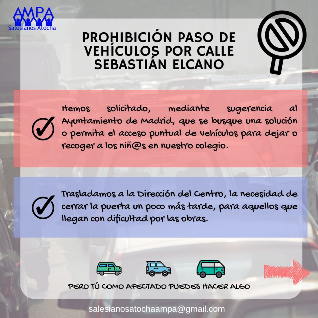 Con el inicio de las obras de ampliación de la Línea 11 de Metro, muchas familias de Salesianos Atocha están sufriendo dificultades en las entradas y salidas diarias al colegio. En particular, la prohibición del tráfico en la calle Sebastián Elcano ha generado grandes inconvenientes para aquellos que necesitan dejar o recoger a sus hijos en coche, complicando aún más el ya de por sí agitado comienzo y fin de las jornadas escolares.