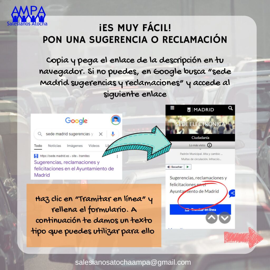 «Buenas tardes, mi nombre es ………………………………………… y escribo como afectad@ por las obras de la Línea 11 de Metro, motivo por el cual se han producido cambios en la circulación en todas las calles cercanas al colegio Salesianos Atocha, colegio de nuestr@s hij@s.